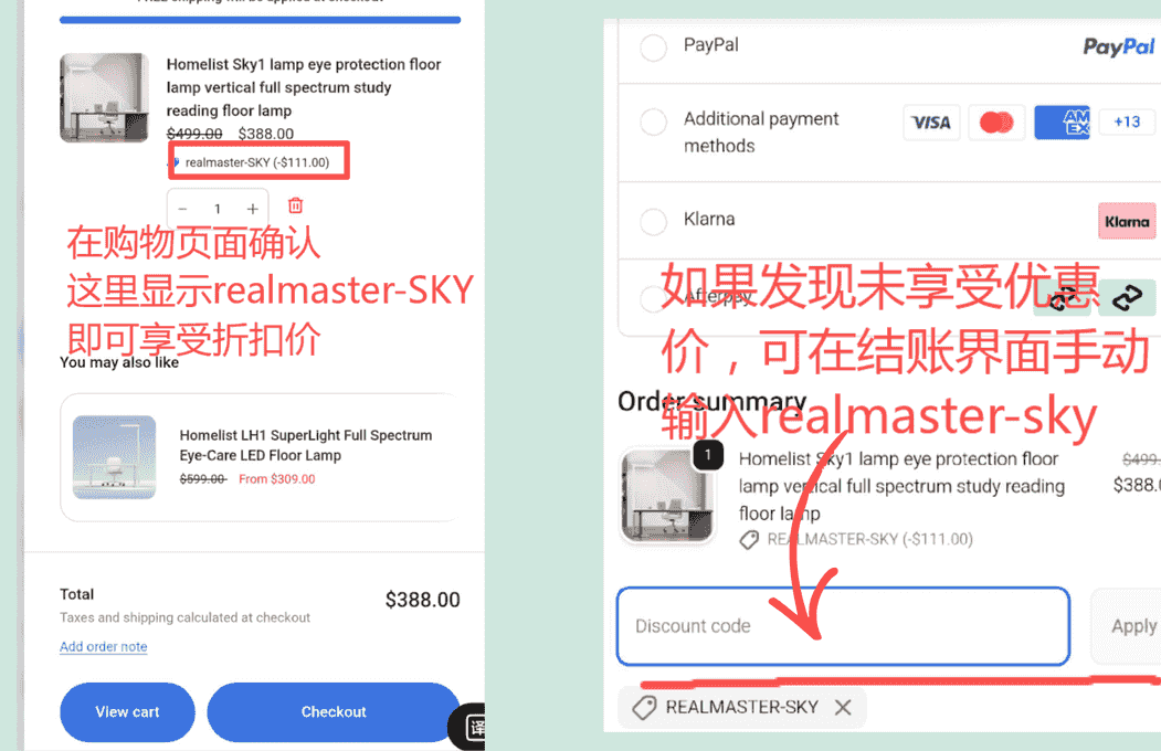 如未自动显示,可在 Discount Code 栏输入:realmaster-sky
