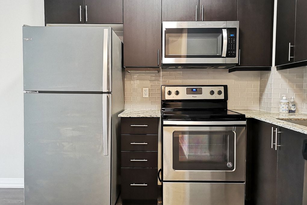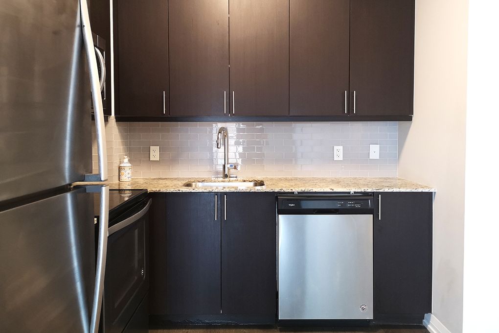 落地窗转角公寓,宽敞阳台, 功能性开放式布局。整个现代强化木地板-带花岗岩柜台和不锈钢器具的现代厨房,大型步入式壁橱